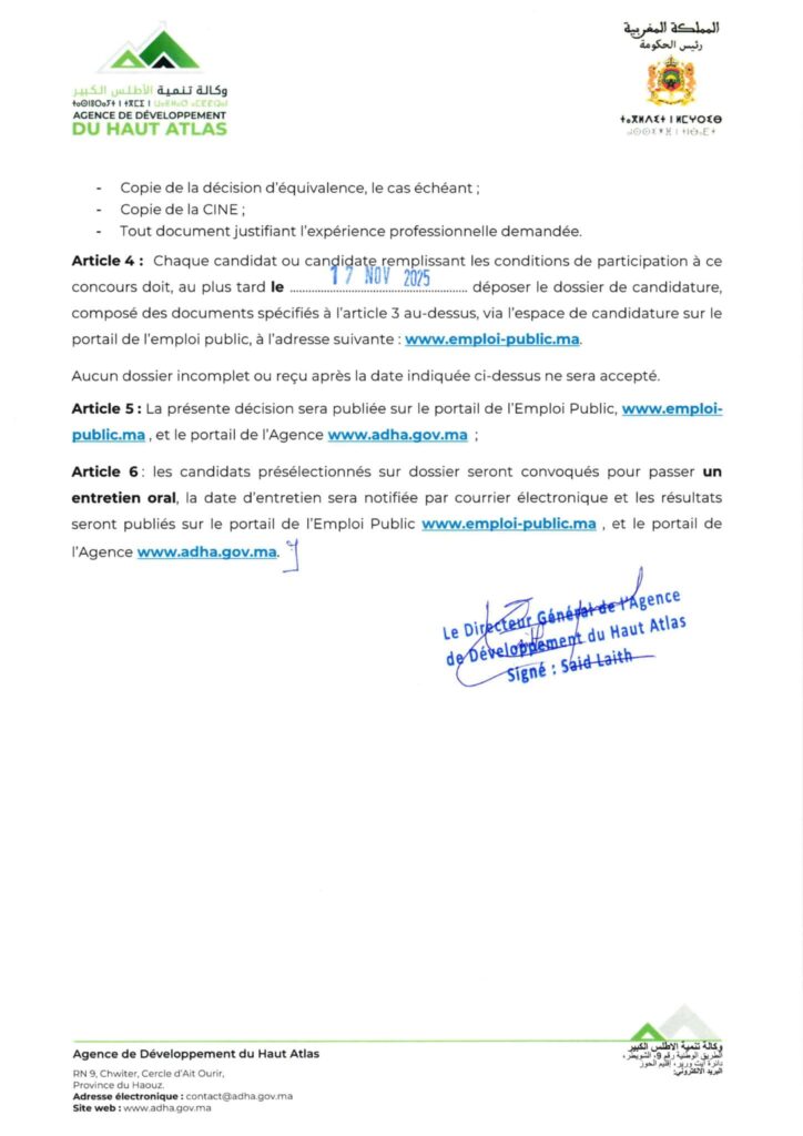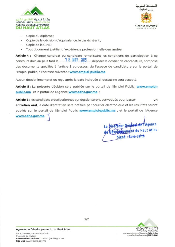 Agence de Développement du Haut Atlas : (ADHA) organise en 2025 un concours pour le recrutement de 5 postes : trois techniciens spécialisés et deux ingénieurs d’État. Cette initiative s’inscrit dans le cadre de ses missions visant à promouvoir le développement économique, social et environnemental des zones du Haut Atlas.