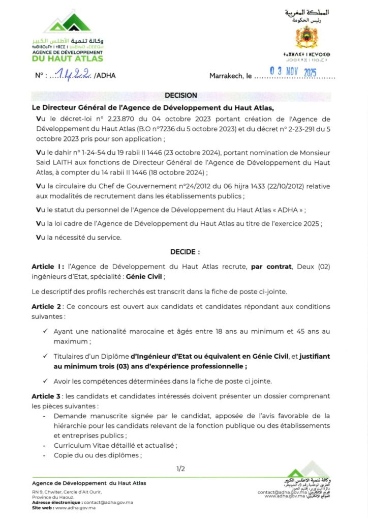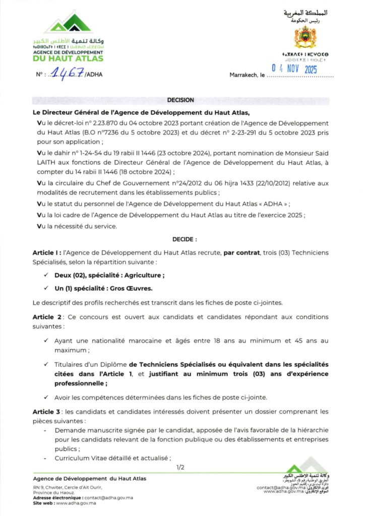 Agence de Développement du Haut Atlas : (ADHA) organise en 2025 un concours pour le recrutement de 5 postes : trois techniciens spécialisés et deux ingénieurs d’État. Cette initiative s’inscrit dans le cadre de ses missions visant à promouvoir le développement économique, social et environnemental des zones du Haut Atlas.
