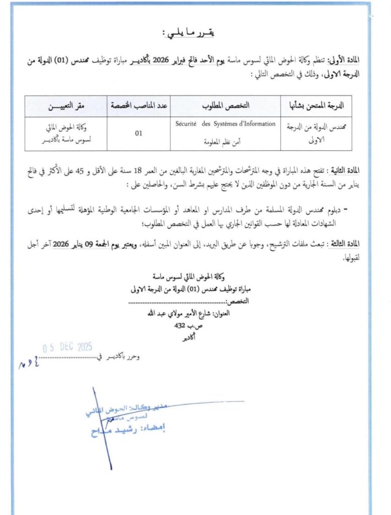 Le concours de l’Agence du Bassin Hydraulique de Souss Massa constitue une occasion unique pour les professionnels et les jeunes diplômés de se lancer dans une carrière valorisante dans le secteur de l’eau. Avec un poste d’administrateur à pourvoir, le concours offre une stabilité professionnelle, une mission à forte valeur sociale et environnementale, et la possibilité de contribuer au développement durable de la région Souss-Massa.