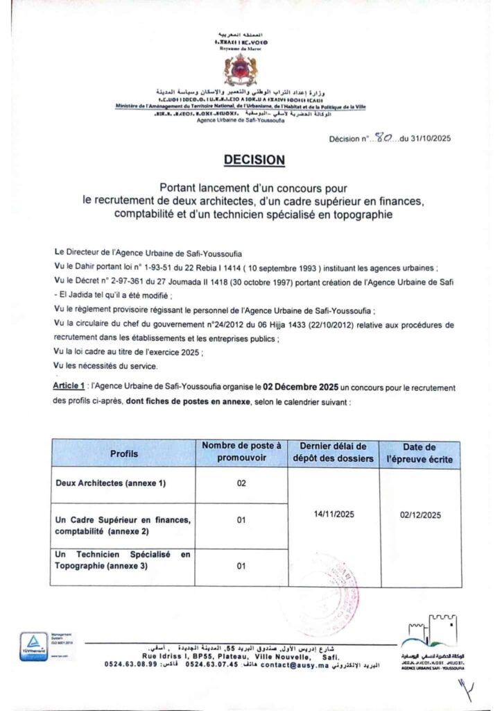 Agence Urbaine de Safi lance pour l’année 2025 un concours de recrutement visant à pourvoir quatre postes stratégiques au sein de ses équipes. Cette initiative représente une opportunité unique pour les professionnels et jeunes diplômés désirant participer activement au développement urbain et à l’aménagement territorial. L’objectif principal de cette campagne de recrutement est de renforcer les compétences techniques et administratives de l’agence, tout en assurant la qualité et l’efficacité de ses projets.