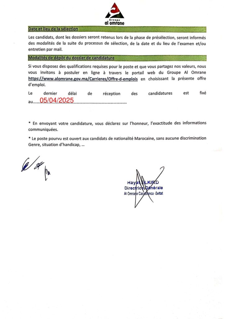 Les candidatures doivent être déposées en ligne via le portail officiel du Groupe Al Omrane avant le 5 avril 2025. Les candidats présélectionnés seront contactés par e-mail pour les étapes suivantes du processus de recrutement, qui pourront inclure des tests écrits et des entretiens individuels.