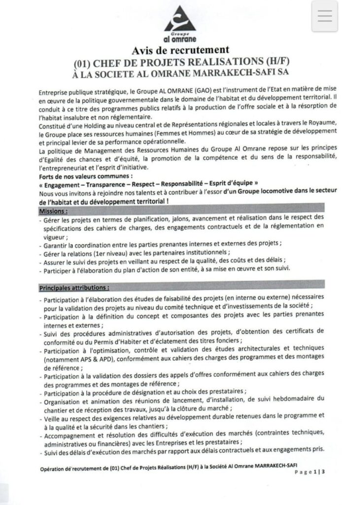 Le concours « Al Omrane Recrute : Offre de concours » couvre plusieurs profils :