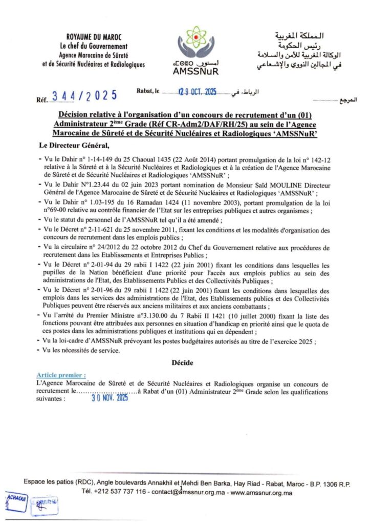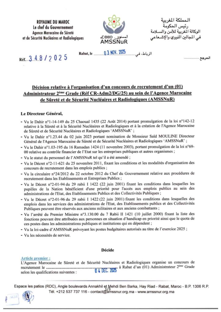 AMSSNuR : L’Agence Marocaine de Sûreté et de Sécurité Nucléaires et Radiologiques (AMSSNuR) ouvre un concours en 2025 pour recruter trois postes d’Administrateur de 2e grade. Cet article fournit toutes les informations nécessaires pour comprendre le profil recherché, les missions, les conditions de candidature et la préparation optimale pour réussir le concours. Pour des ressources supplémentaires et des guides de préparation, consultez notre site Wrokk.