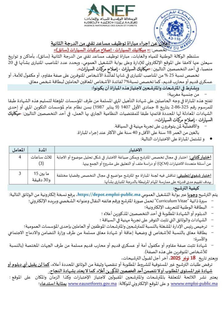 Les candidats retenus participeront à la mise en œuvre de missions techniques sur le terrain et dans les services de l’ANEF, contribuant directement aux objectifs de conservation, de développement rural et de lutte contre la désertification. Il s’agit d’un poste stable offrant des perspectives de carrière solides et un impact concret sur le territoire national.