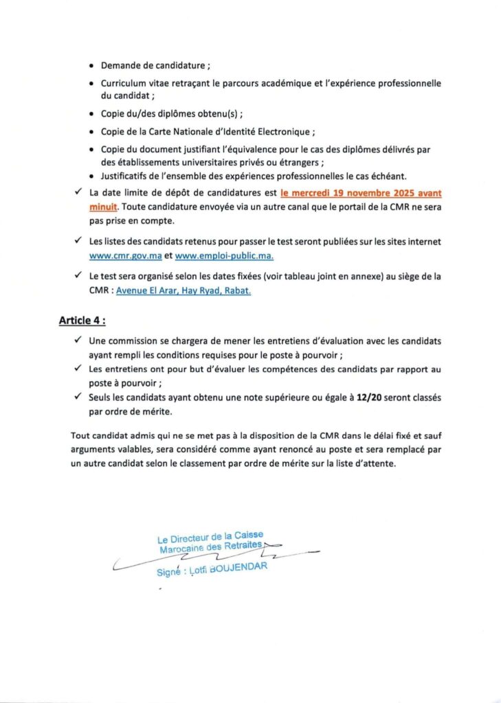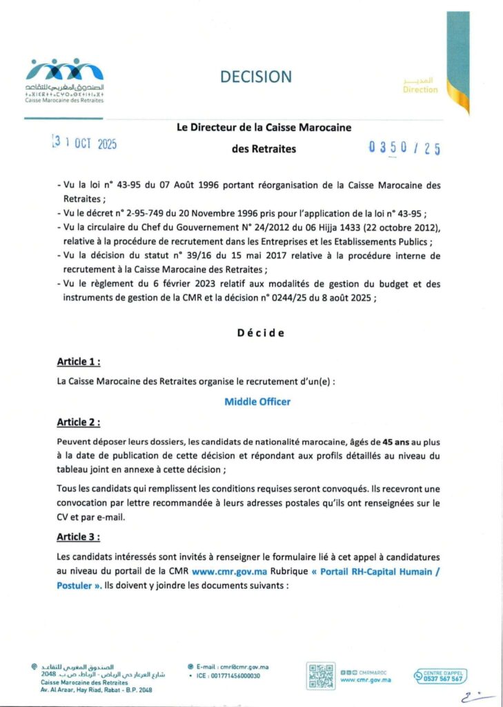Le concours de recrutement CMR 2025 s’impose comme une occasion privilégiée pour rejoindre une institution incontournable du système de retraite marocain. En publiant cette offre de concours, la CMR Recrute des profils ambitieux, compétents et prêts à s’investir dans la gestion de ressources essentielles à la stabilité du pays.