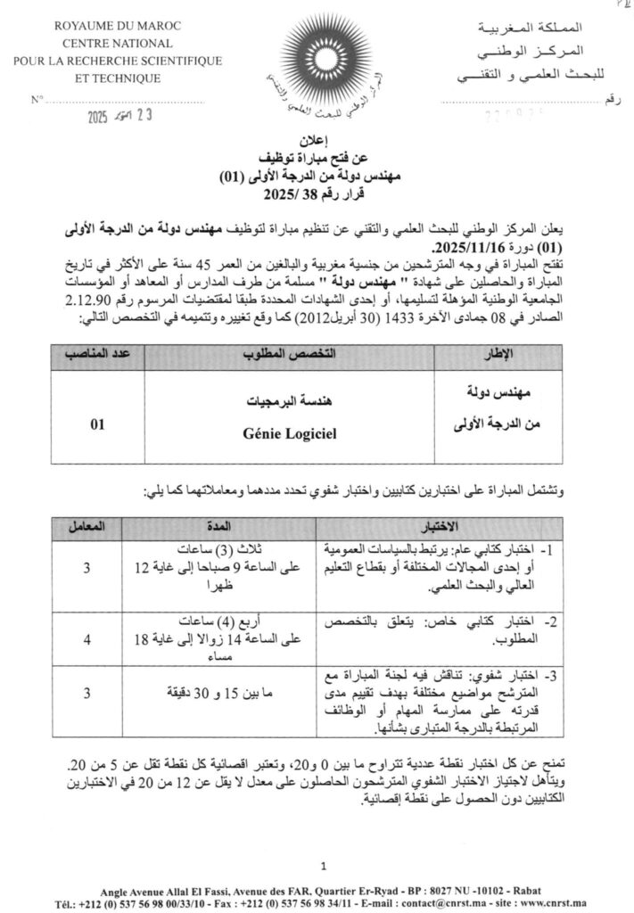 CNRST recrute : offre de concours 2025 vient d’être officiellement annoncée. Le Centre National pour la Recherche Scientifique et Technique (CNRST) propose cinq postes dans différents domaines, destinés aux candidats souhaitant contribuer au développement scientifique et technologique du Maroc. Cette opportunité est une porte d’entrée vers une carrière publique au sein d’un établissement de référence.