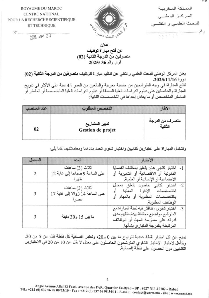 L’offre de concours CNRST Recrute : offre de concours 2025 comprend cinq postes répartis comme suit :
