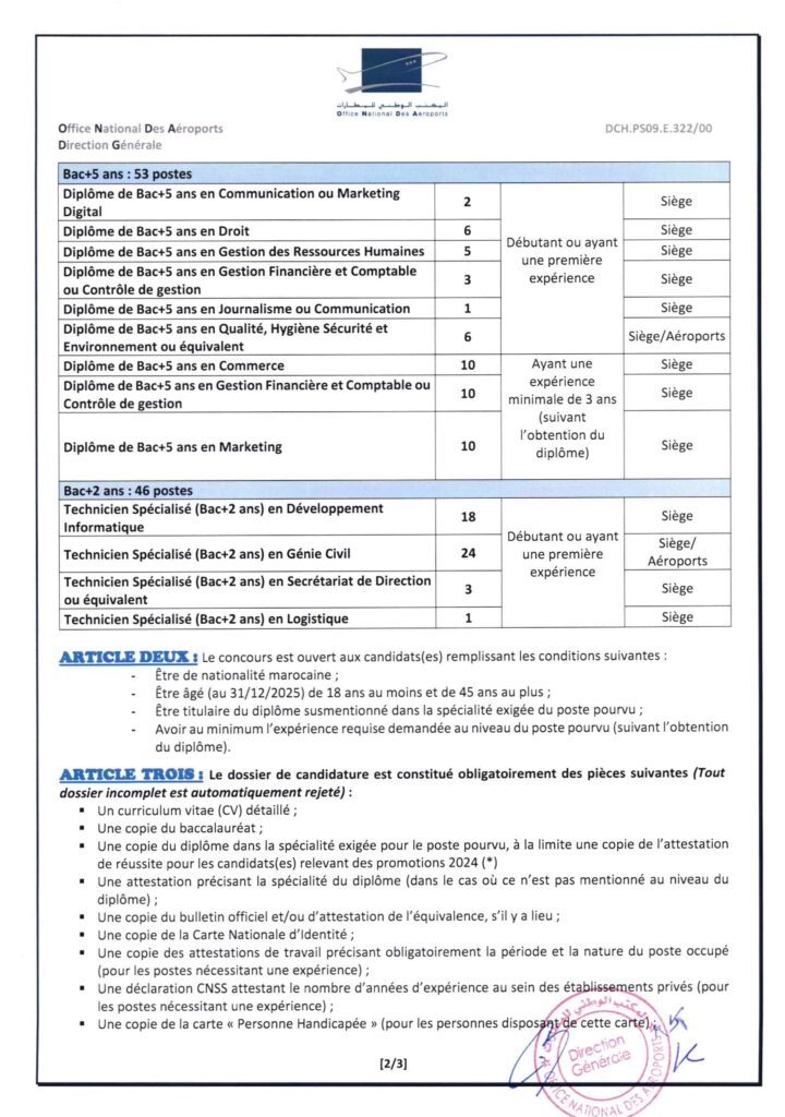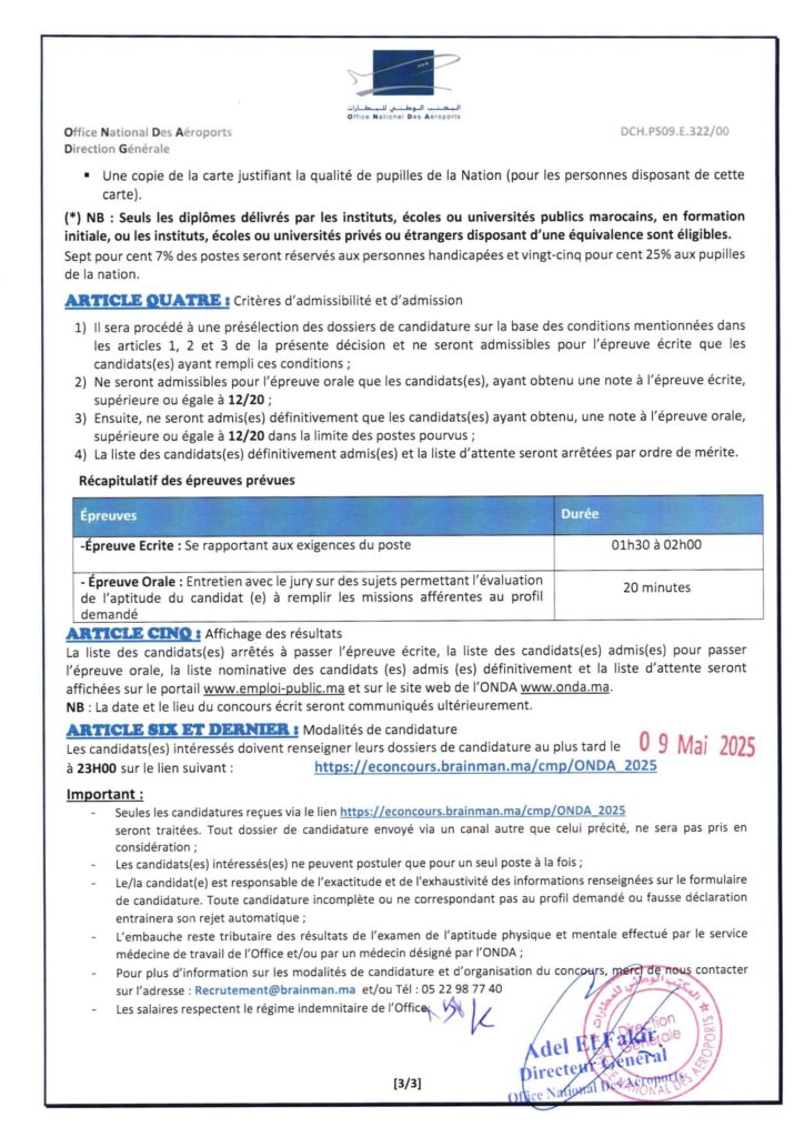 - Affectation : Siège de l’ONDA ou différents aéroports du Royaume.