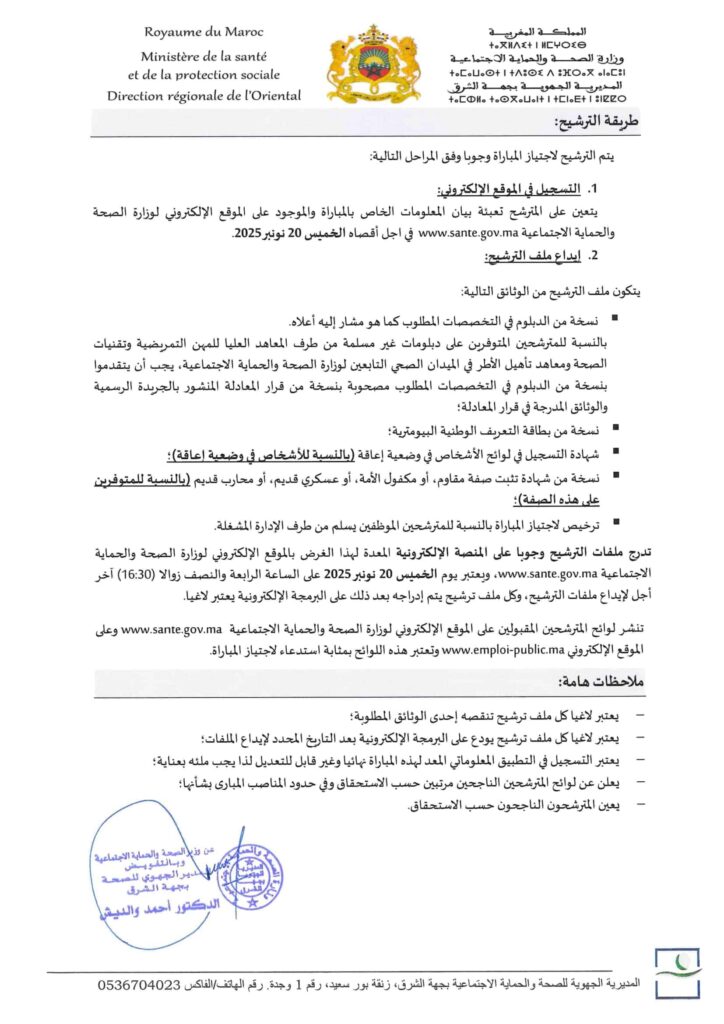 - Fournir un dossier complet selon les modalités fixées par la DR Santé Oriental.