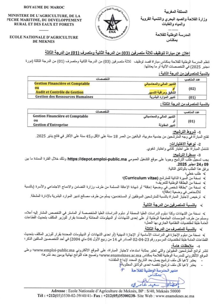 L’ENAM Meknès est un établissement public dédié à la formation d’ingénieurs agronomes, à la recherche scientifique et technique dans le domaine agricole, et au développement du secteur rural national. Pour assurer un fonctionnement optimal et accompagner ses projets de développement, l’école organise un concours pour deux postes : un Administrateur 2ᵉ grade et un Technicien 3ᵉ grade.