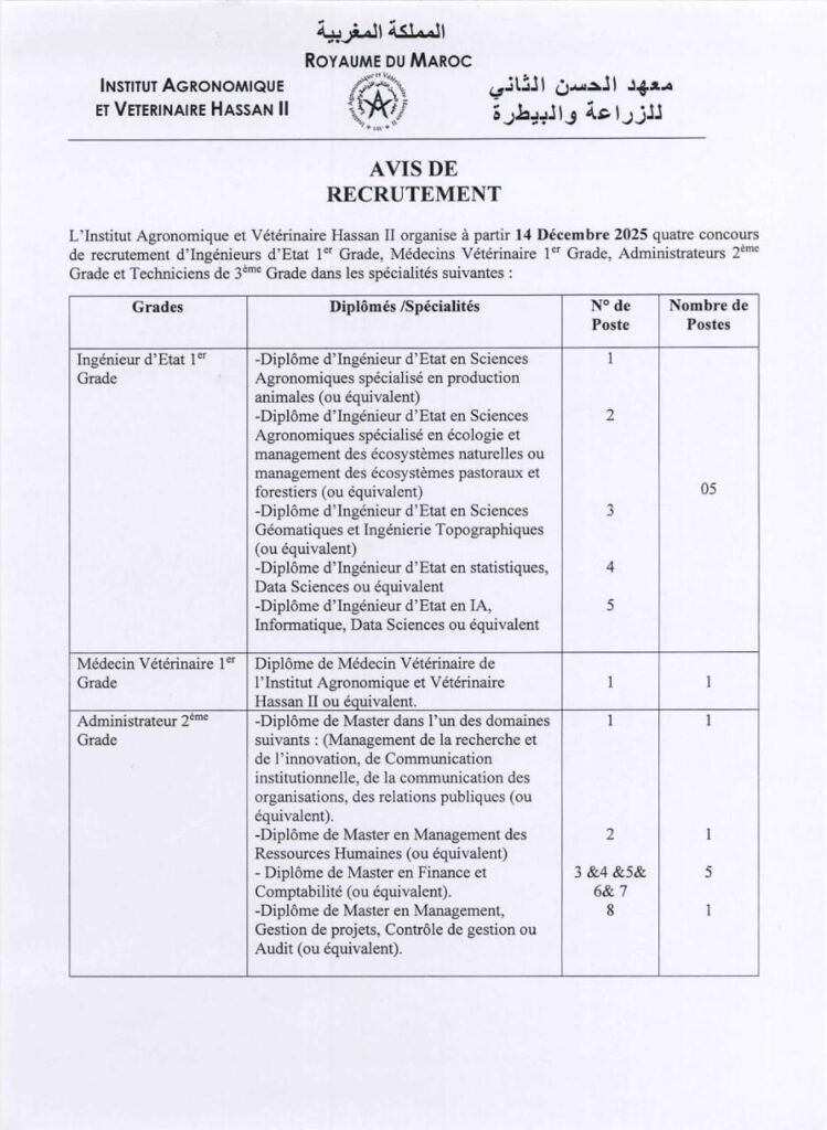 L’IAV Hassan II recrute actuellement via une offre de concours structurée et adaptée à différents profils. Intégrer l’institut représente une opportunité majeure pour construire une carrière stable, participer à des projets de recherche et de développement et contribuer activement à l’agriculture et au secteur vétérinaire du Maroc.