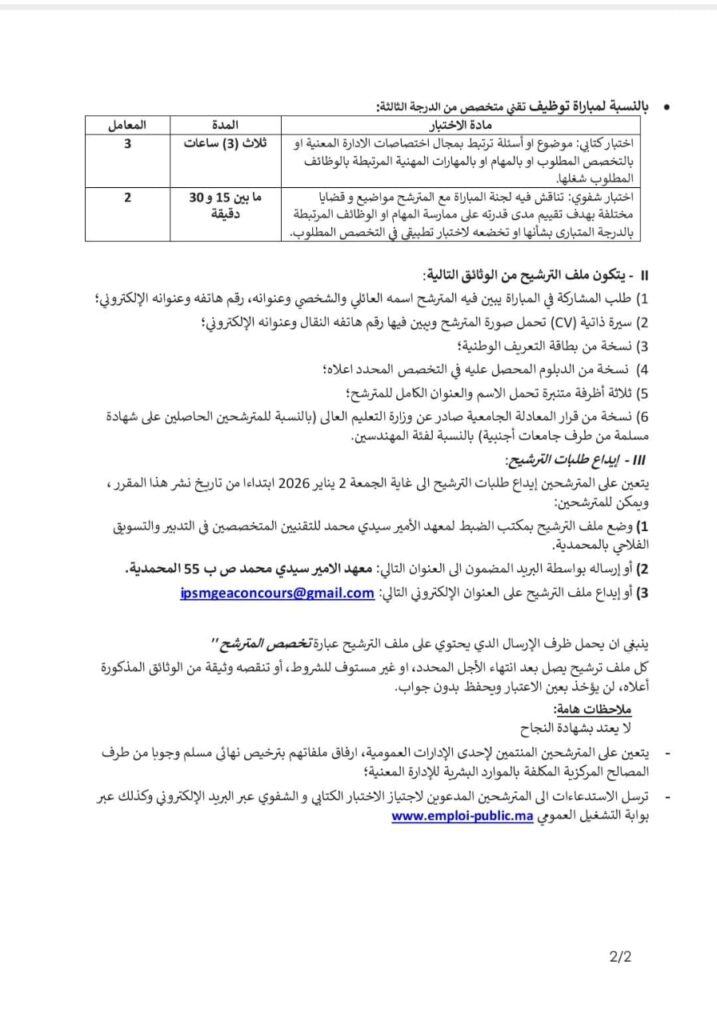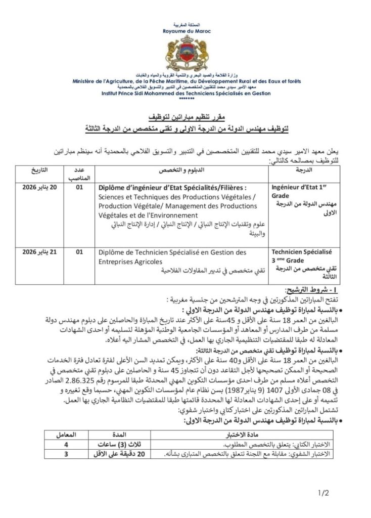 Institut Prince Sidi Mohammed des Techniciens Spécialisés en Gestion et Commerce Agricole lance un concours de recrutement pour un poste de Technicien de 3ème grade – Échelle 9. Cette opportunité s’inscrit dans le cadre des concours nationaux organisés au Maroc pour renforcer les ressources humaines des institutions publiques spécialisées dans l’agriculture et la gestion des entreprises agricoles.