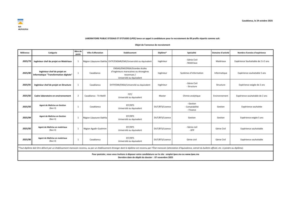 Ce concours s’inscrit dans la stratégie du LPEE visant à renforcer ses équipes dans différentes régions du Maroc afin de soutenir les projets d’infrastructure et d’innovation.