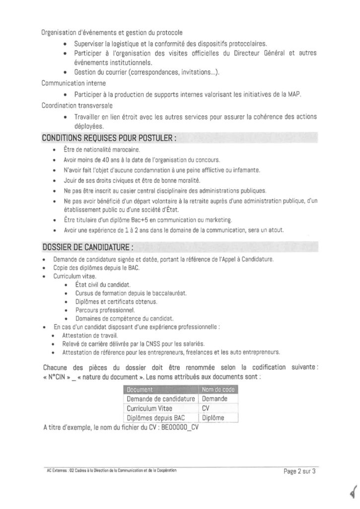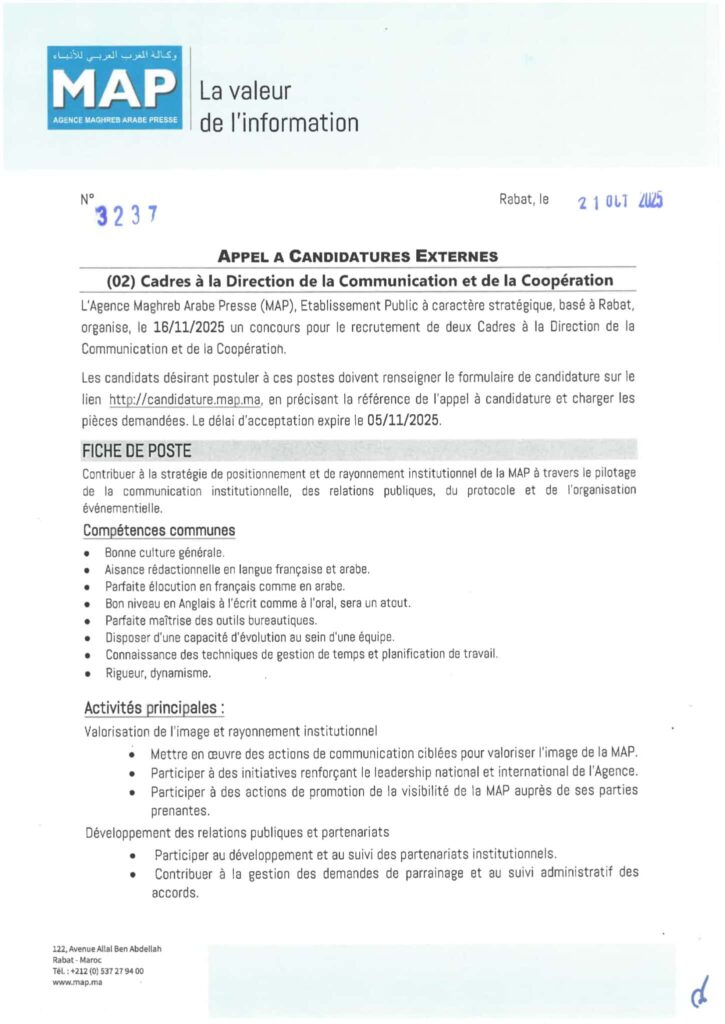 Maghreb Arabe Presse : Le concours MAP Maghreb Arabe Presse 2025 ouvre 2 postes cadres à la Direction de la Communication et de la Coopération. Candidatures jusqu’au 5 novembre. Détails ici.