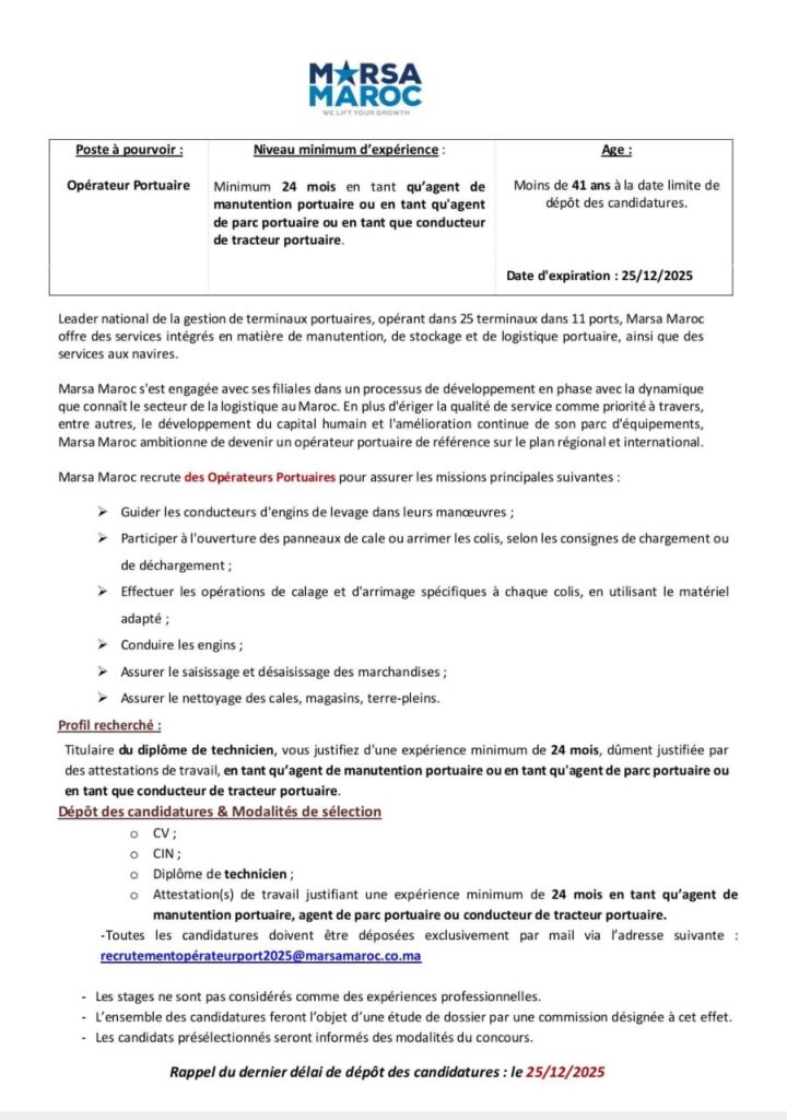 Ces offres visent à renforcer les équipes techniques et opérationnelles afin d’accompagner le développement des activités portuaires sur l’ensemble du territoire marocain.