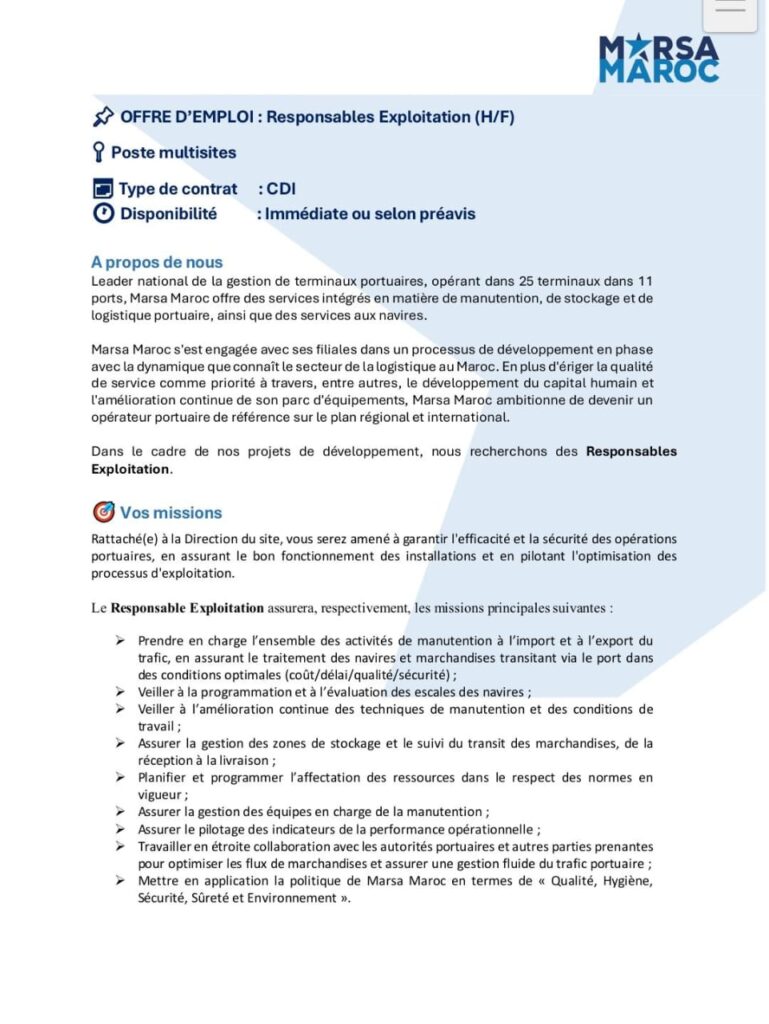 Le poste de Responsable Exploitation au Maroc chez Marsa Maroc représente une opportunité exceptionnelle pour les ingénieurs expérimentés souhaitant évoluer dans le secteur portuaire. Avec des missions stratégiques, un cadre structuré et la possibilité de contribuer au développement d’un acteur clé de l’économie nationale, ce poste est idéal pour bâtir une carrière solide.