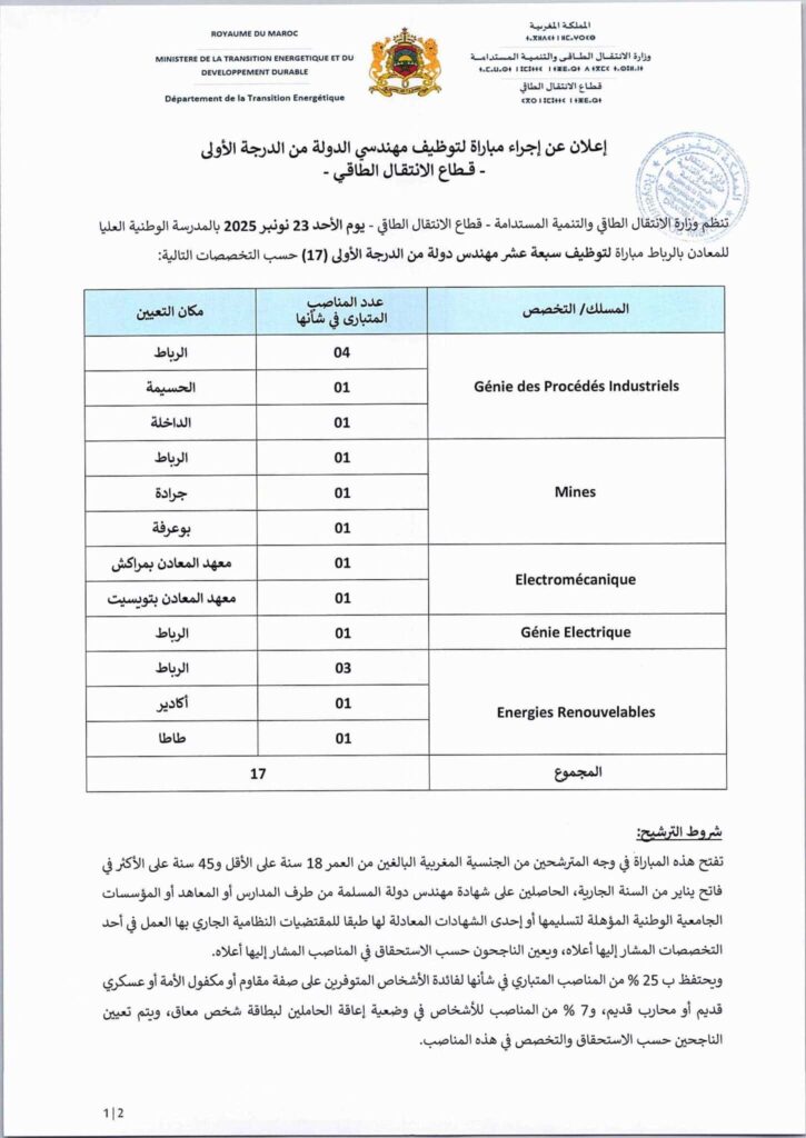 Le Ministère de la Transition Énergétique Recrute : offre de concours 2025 constitue une opportunité rare pour les jeunes diplômés et les professionnels souhaitant participer activement au développement durable du Maroc. Avec 40 postes ouverts pour divers profils, ce concours public s’adresse à des candidats motivés, compétents et désireux de contribuer à un secteur d’avenir.