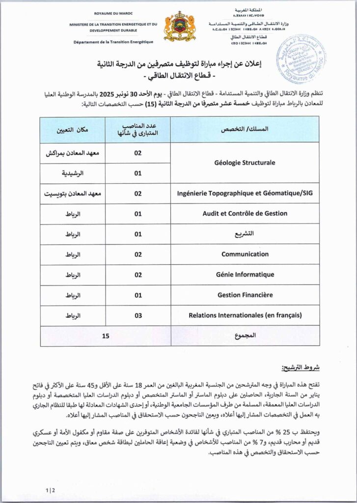 Ministère de la Transition Énergétique : Le Ministère de la Transition Énergétique et du Développement Durable annonce officiellement l’ouverture d’un concours de recrutement 2025 pour pourvoir 40 postes dans différents corps et grades. Cette campagne de recrutement s’inscrit dans la stratégie nationale visant à renforcer les ressources humaines dans le domaine de l’énergie, des mines et de la géologie.