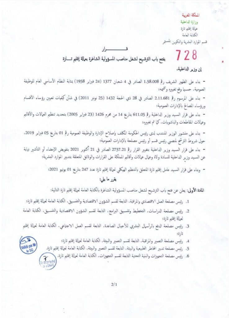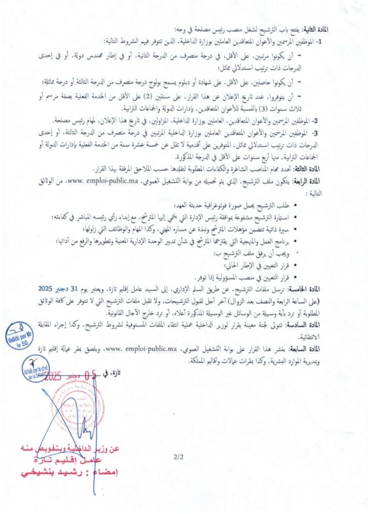 Plusieurs postes de responsabilité sont ouverts, notamment des postes de chef de service au sein de l’administration territoriale de Taza. Ces postes requièrent des compétences et des qualifications spécifiques dans la gestion administrative, la coordination des services publics et la mise en œuvre de projets locaux.