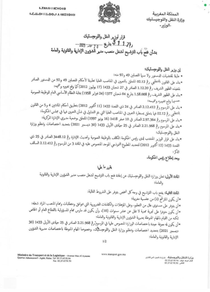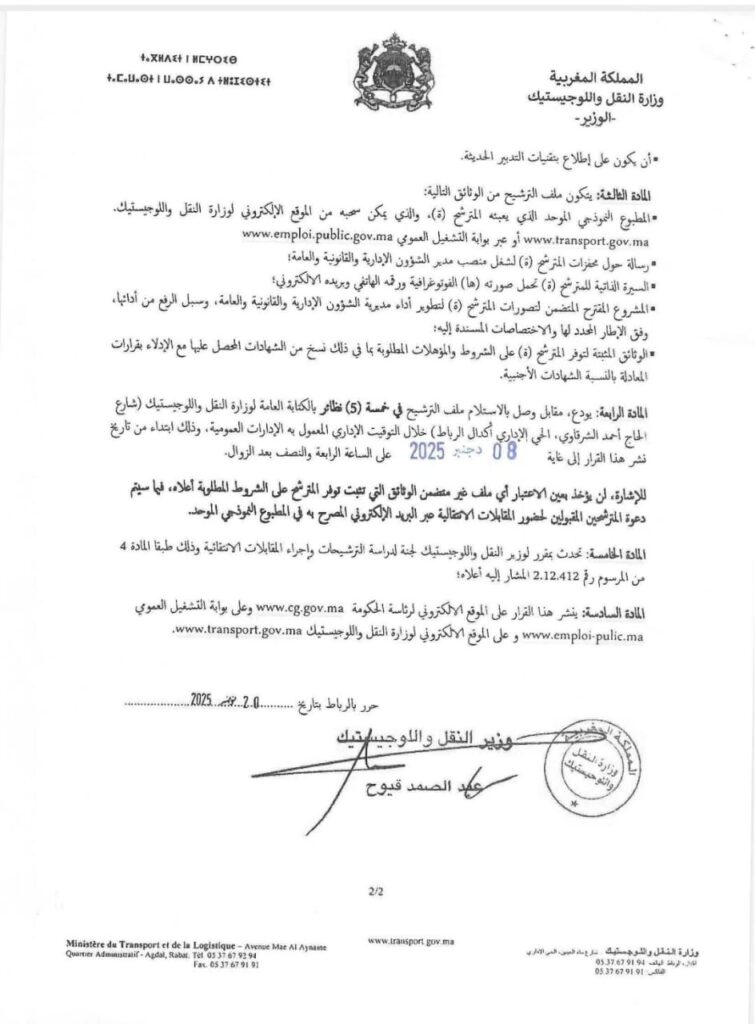 Le concours 2025 du Ministère du Transport et de la Logistique constitue une véritable opportunité pour les candidats titulaires d’un diplôme technique souhaitant intégrer le secteur public marocain. Avec des postes disponibles en tant que technicien de 3ᵉ grade ou adjoint technique de 2ᵉ grade, ce recrutement offre stabilité, responsabilités et la possibilité de contribuer directement au développement des infrastructures nationales.