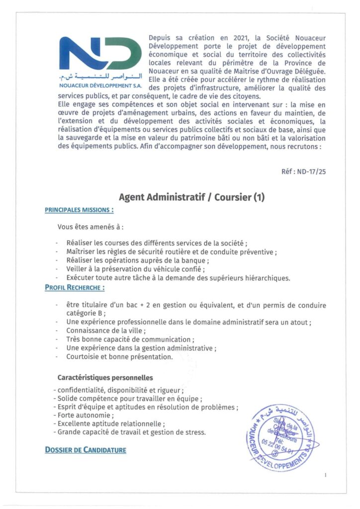 Le concours de Nouaceur Développement 2025 porte sur deux postes distincts, destinés à renforcer les équipes administratives et techniques de la société.