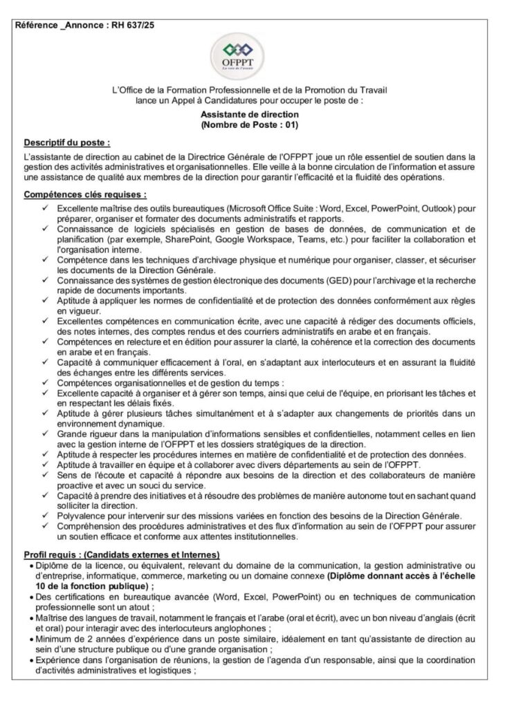 OFPPT : L’Office de la Formation Professionnelle et de la Promotion du Travail (OFPPT) a publié une nouvelle offre de concours pour le recrutement d’une Assistante de direction au cabinet de la Directrice Générale, dans le cadre de ses opérations de renforcement des ressources humaines pour l’année 2025. Cette annonce concerne le poste basé à Casablanca, offrant une opportunité unique pour les candidats souhaitant intégrer une institution publique de référence au Maroc dans le domaine de la formation professionnelle et du développement des compétences.
