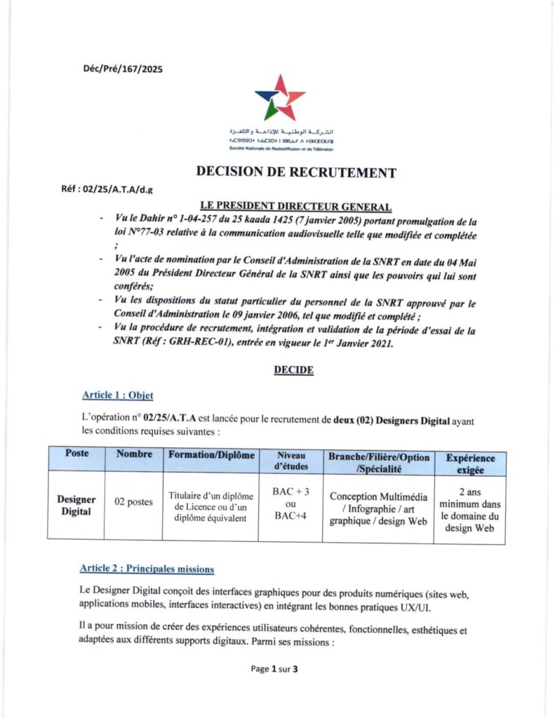 La SNRT Recrute : Offre de concours représente une occasion rare pour les candidats ambitieux de rejoindre le secteur public audiovisuel au Maroc. Avec 5 postes disponibles pour l’année 2026, ce concours offre des opportunités variées allant du design numérique à l’ingénierie technique.