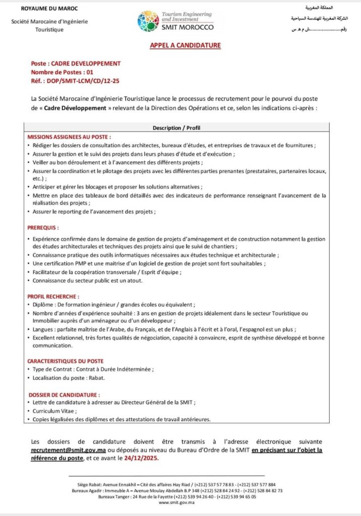 Société Marocaine d’Ingénierie Touristique (SMIT) constitue un acteur central dans le développement touristique national. Chargée de piloter la stratégie touristique du Royaume, la SMIT intervient dans l’aménagement des territoires, le suivi de projets structurants et la valorisation des ressources locales. Pour accompagner ses missions et soutenir la mise en œuvre de la feuille de route touristique 2023‑2026, l’organisation lance régulièrement des offres de concours pour recruter des profils variés.