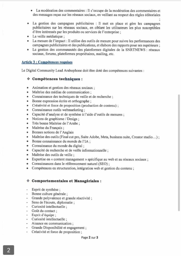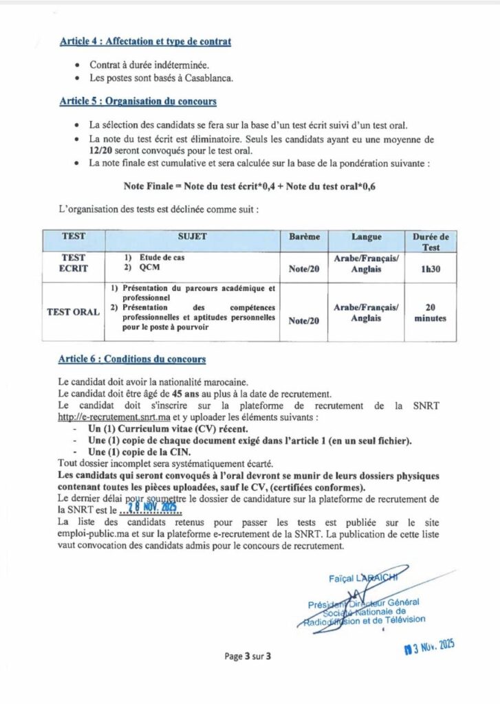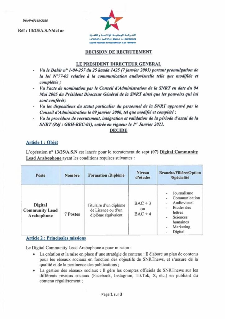Société Nationale de Radiodiffusion (SNRT) lance une campagne de recrutement par concours public, destinée à renforcer ses équipes et à accompagner sa transformation numérique et audiovisuelle. Cette offre représente une opportunité unique pour les candidats souhaitant intégrer un environnement professionnel stimulant et orienté vers le service public. La campagne cible des profils variés et permet de contribuer activement au développement des médias nationaux.