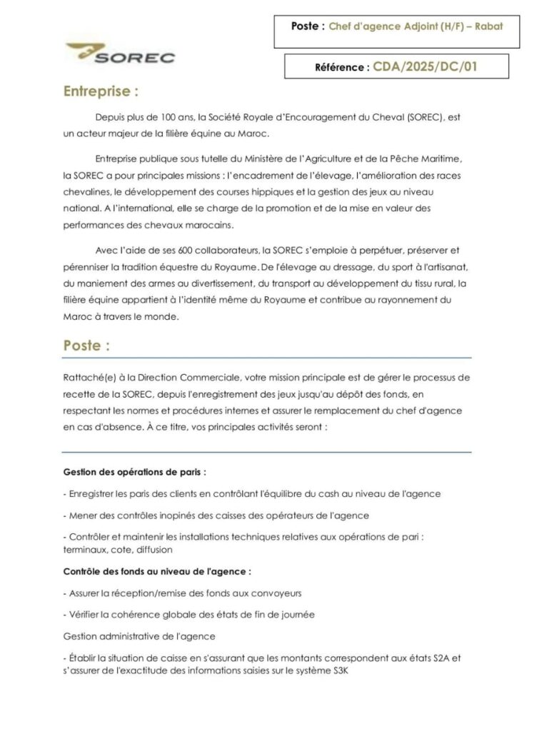 Rejoindre la SOREC permet d’intégrer une institution nationale de référence, d’œuvrer pour la promotion du cheval et de la filière hippique, tout en bénéficiant d’une carrière stable et de perspectives de développement. Pour les passionnés d’équitation ou du secteur hippique, c’est une chance unique d’allier passion et profession.