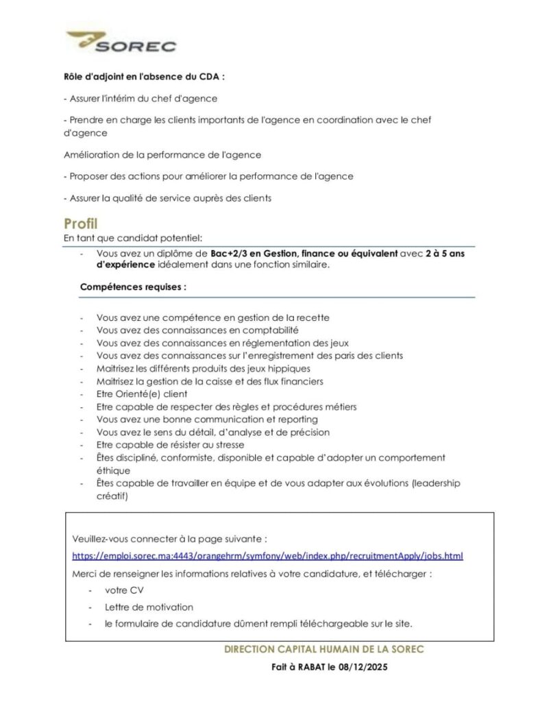Les postes proposés par la SOREC sont diversifiés. Parmi les postes fréquents :