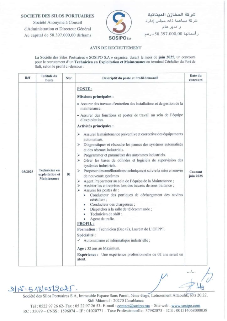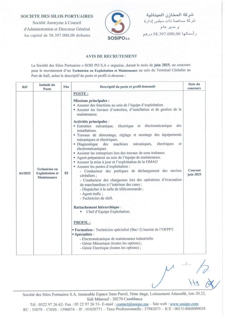 Créée en 1986, SOSIPO est une entreprise publique spécialisée dans la gestion des services portuaires, notamment le pilotage, le remorquage, l’amarrage et les services nautiques. Elle agit également en tant que prestataire de solutions d’ingénierie maritime et de conseil, au profit de l’ensemble des ports marocains et d’opérateurs internationaux.