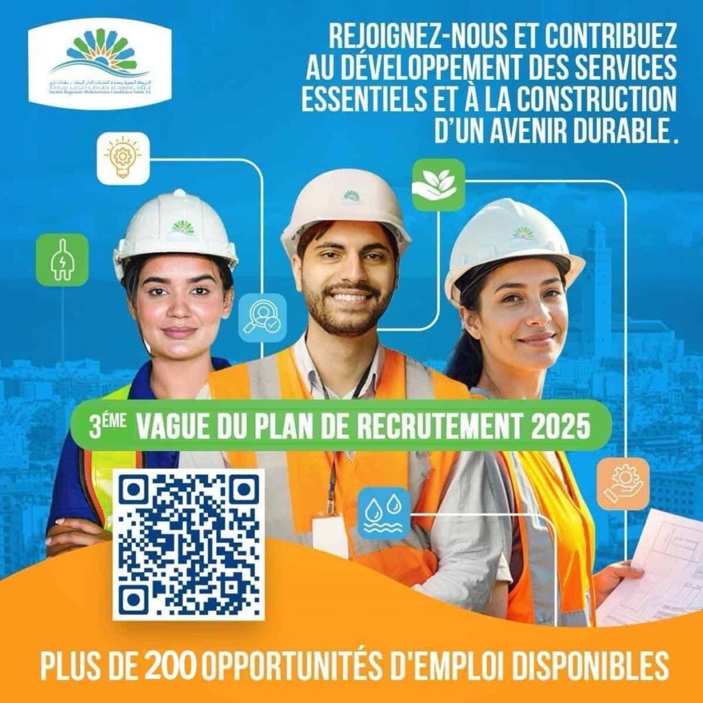 SRM Casablanca‑Settat (SRM Casablanca‑Settat) lance en 2025 une importante campagne de recrutement dans le cadre de son plan stratégique. Le mot d’ordre est clair : SRM Casablanca‑Settat recrute via une offre de concours destinée à pourvoir plus de 200 postes dans divers métiers, afin de renforcer ses équipes et son rôle fondamental dans les services publics de la région.