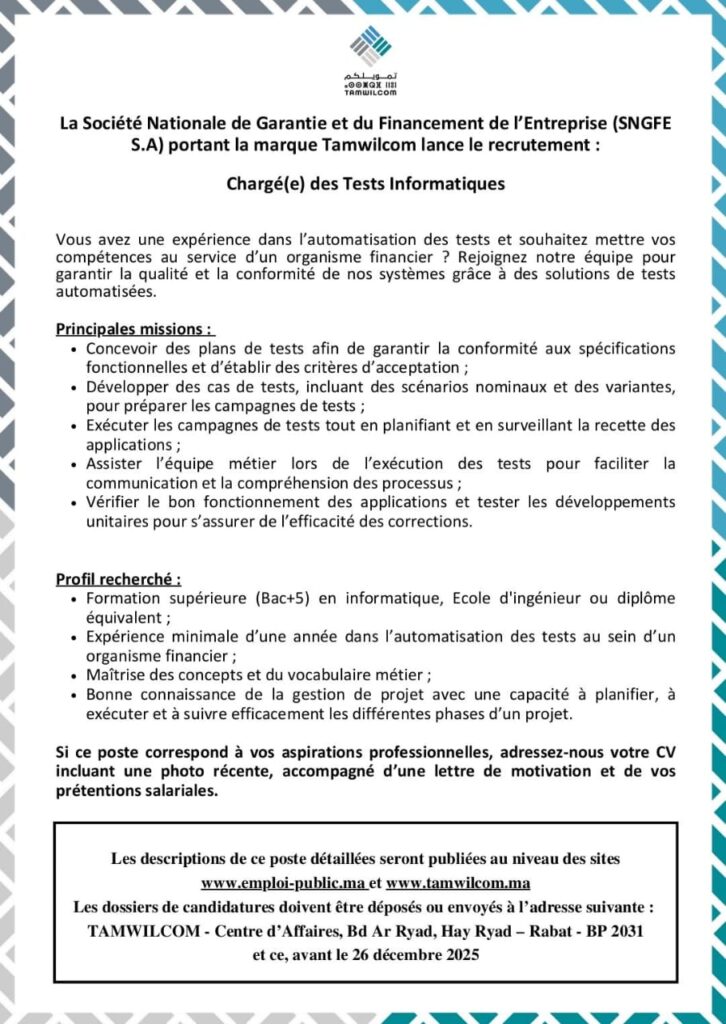 Le concours 2025 de Tamwilcom est une occasion précieuse pour les candidats motivés d’intégrer une institution stratégique et de contribuer au développement économique du Maroc. Que votre profil soit orienté finance, comptabilité, crédit ou data, ces postes offrent des opportunités concrètes pour progresser dans votre carrière tout en participant à des missions à forte valeur ajoutée.