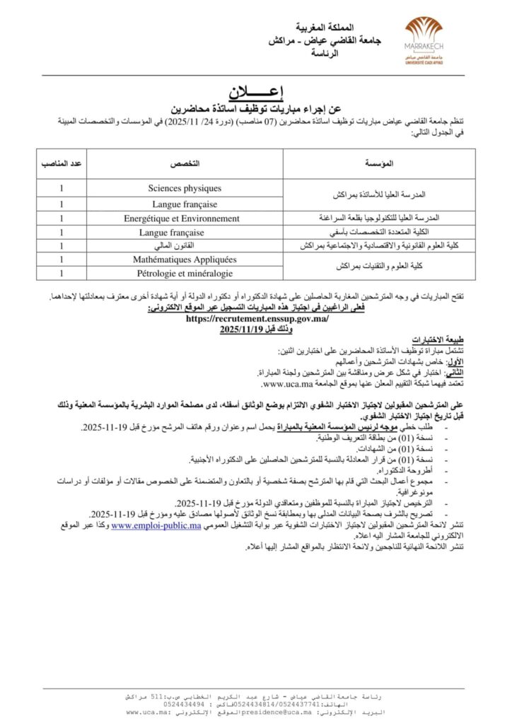 L’annonce du concours « Université Cadi Ayyad recrute : Offre de concours » représente une excellente opportunité pour les enseignants-chercheurs souhaitant rejoindre un établissement reconnu pour son excellence académique et scientifique. Avec une date limite de dépôt des candidatures fixée au 18 novembre 2025 et un concours prévu le 24 novembre 2025, il est temps de finaliser votre dossier. La préparation minutieuse et l’utilisation de ressources spécialisées, comme celles proposées sur wrokk, vous permettront de maximiser vos chances de succès et de contribuer activement au développement pédagogique et scientifique de l’Université Cadi Ayyad. et plus d’offres d’emploi public et concours