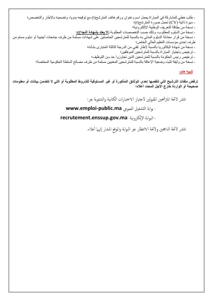 - Documents requis : Curriculum vitae actualisé, copie des diplômes et relevés de notes, copie de la carte d’identité nationale, et toute pièce justificative de l’expérience professionnelle.