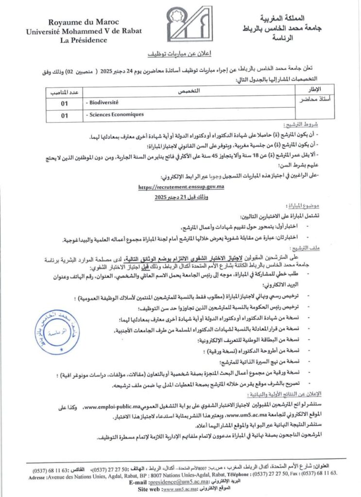 Le recrutement à l’Université Mohammed V témoigne de la volonté de l’établissement de renouveler ses effectifs et d’attirer des profils diversifiés. Que ce soit pour les jeunes diplômés ou les professionnels expérimentés, cette offre de concours ouvre de réelles opportunités pour intégrer un cadre de travail stable et reconnu.