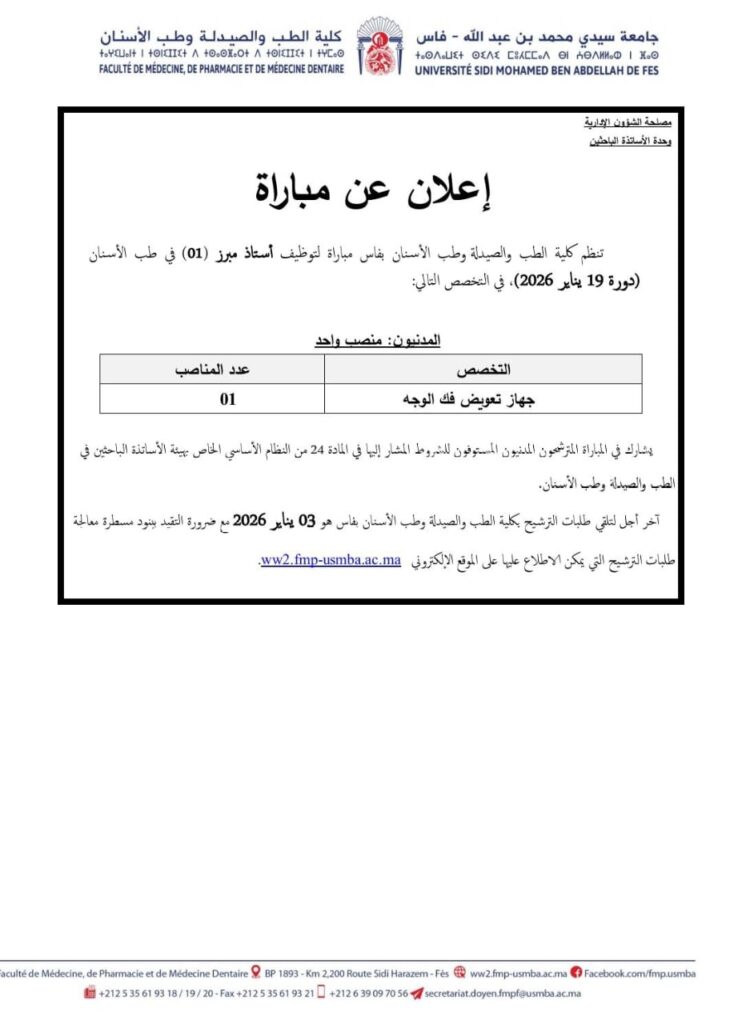 Pour l’année 2025, l’Université Sidi Mohamed Ben Abdellah -Fès- recrute notamment un professeur agrégé, grade A – Échelle 11. La date du concours est fixée au 19 janvier 2026, avec un dépôt des candidatures jusqu’au 3 janvier 2026 à 16h30. Ce concours est ouvert à tous les candidats répondant aux critères de la fonction publique universitaire.