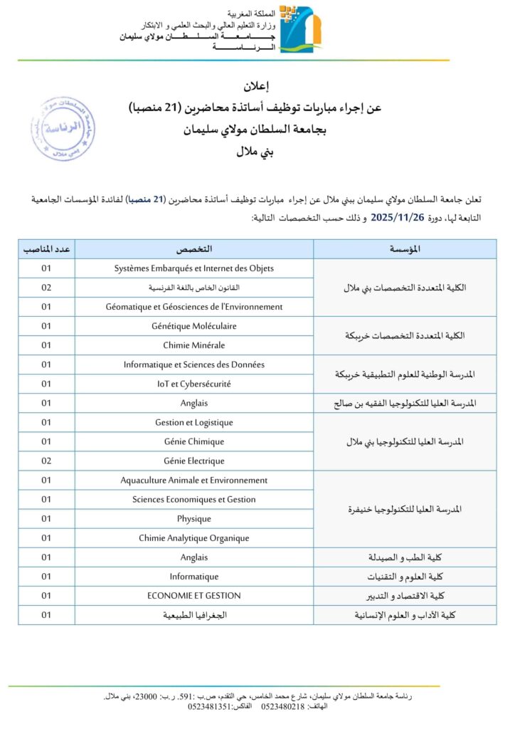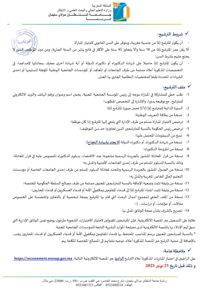 Par cette opération de recrutement, l’Université Sultan Moulay Slimane confirme sa volonté d’investir dans l’excellence académique, la recherche appliquée et le rayonnement scientifique du Maroc.